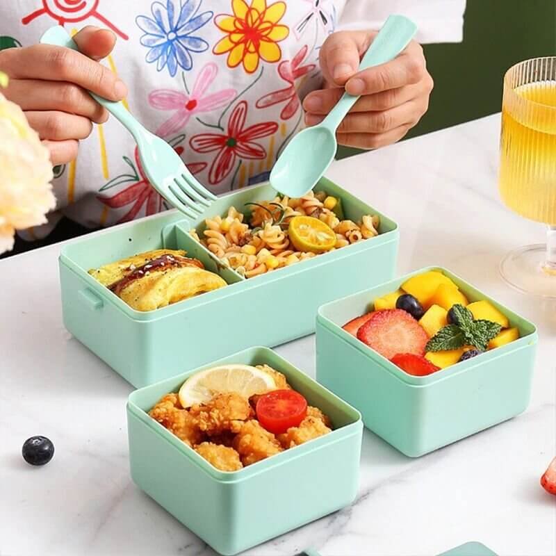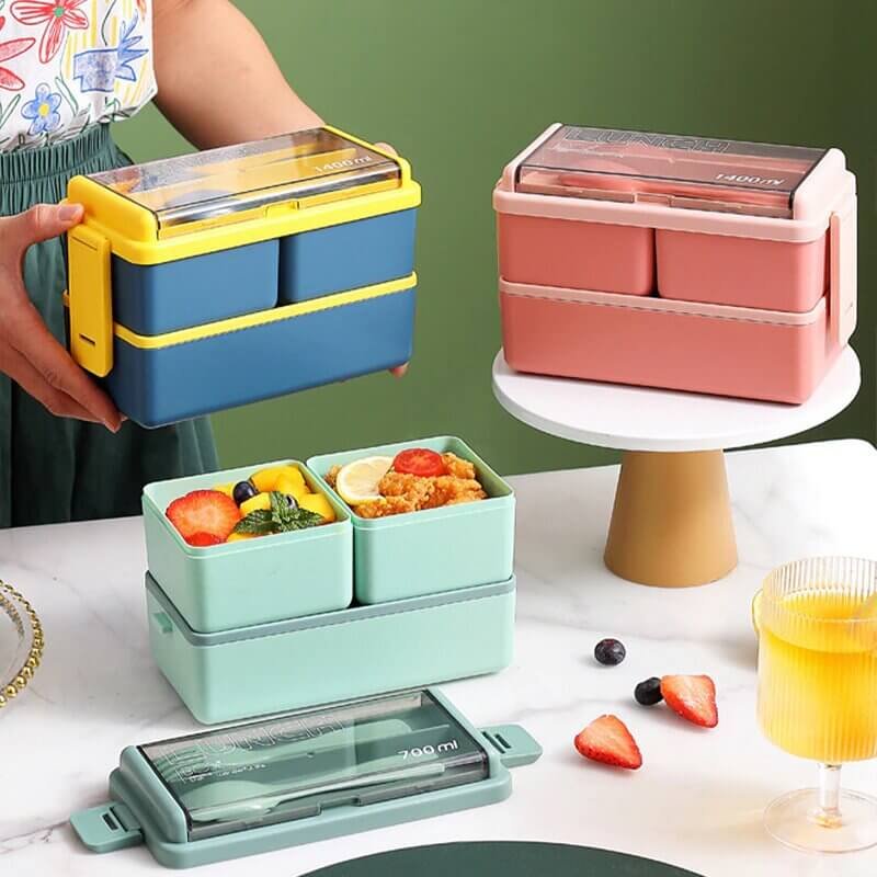 4 In 1 Double Layer Plastic Lunch Box With Cutlery Set